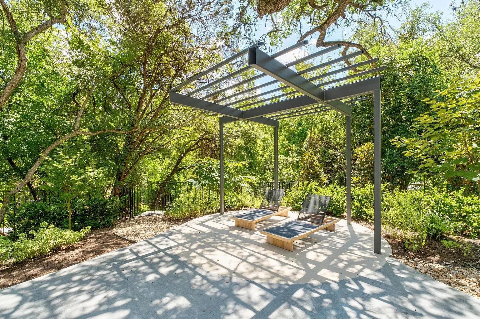 The exterior is just as impressive, offering a serene connection to nature and water. A private pool overlooks the canal, while a winding staircase leads to the dock below, ideal for morning coffee or an afternoon paddle. The backyard is enclosed by lush landscaping and wrought iron fencing, ensuring complete tranquility just minutes from Mount Bonnell and Westwood Country Club.