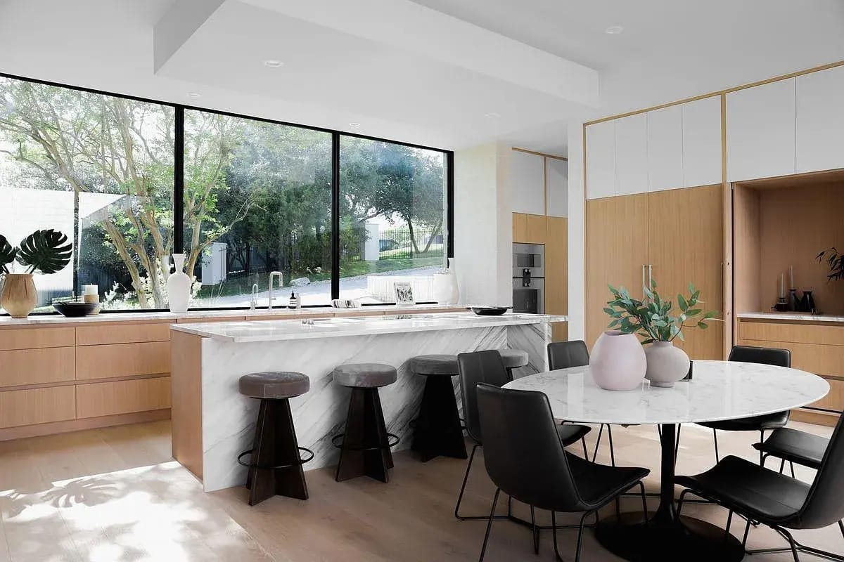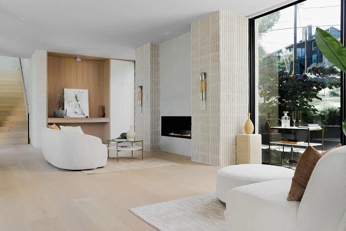 Every detail reflects craftsmanship and thoughtful design. The chef’s kitchen features premium Gaggenau appliances, including professional-grade ovens, integrated refrigeration, and a wine refrigerator, all framed by custom cabinetry and stone counters. The main living area is anchored by a sleek fireplace surrounded by panoramic floor-to-ceiling windows.