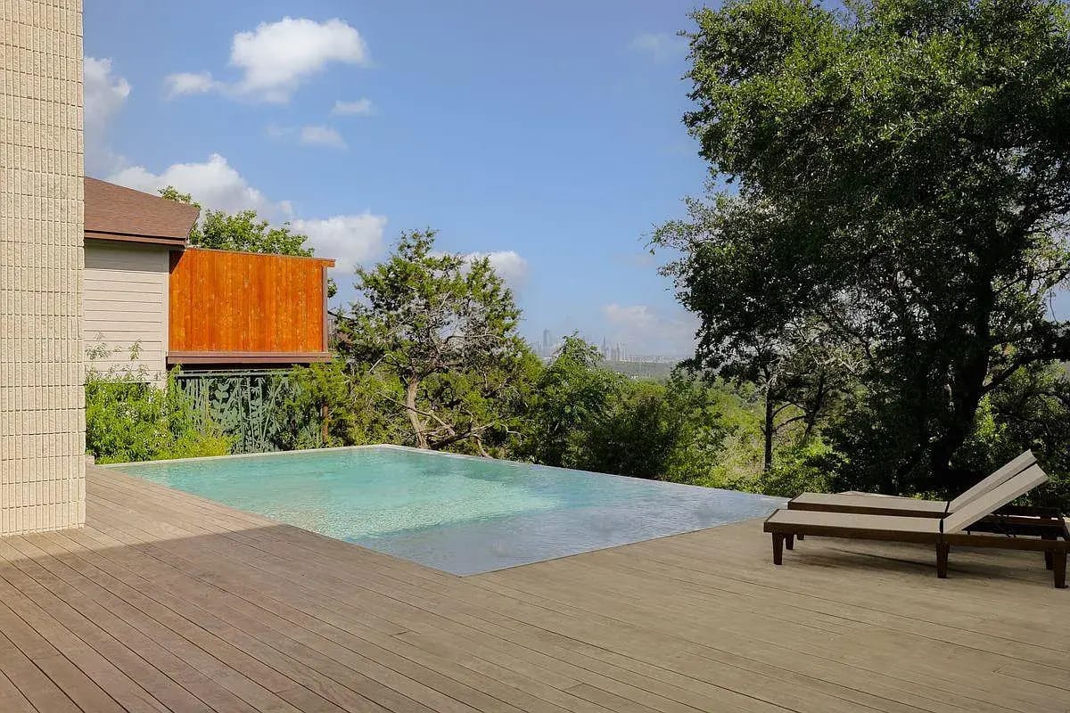 An infinity-edge pool anchors the outdoor living space, appearing to blend with the skyline beyond. Expansive terraces, a covered deck, and a private courtyard extend the home’s living area and invite relaxation in every season. With panoramic views of downtown Austin and the surrounding hills, this residence offers a rare harmony between natural beauty and contemporary design.